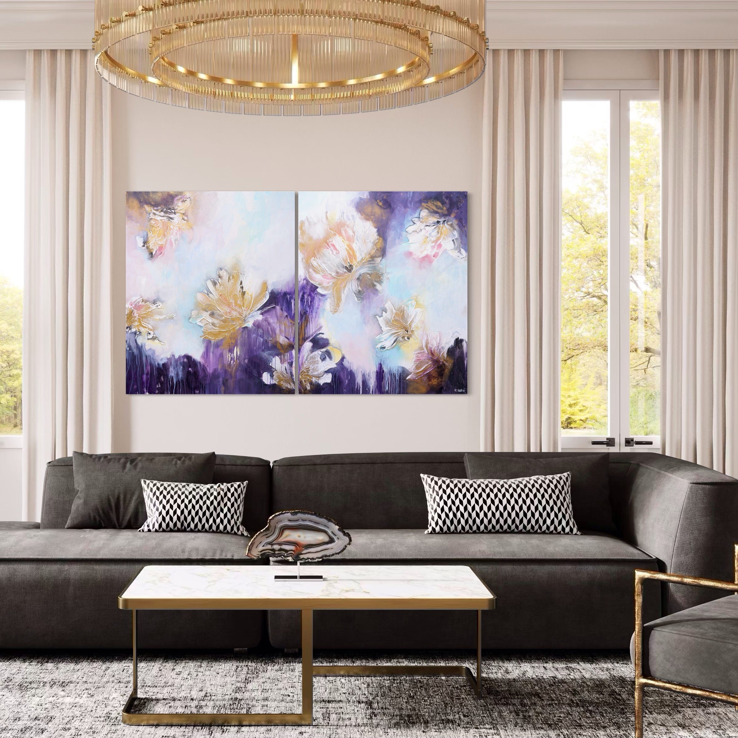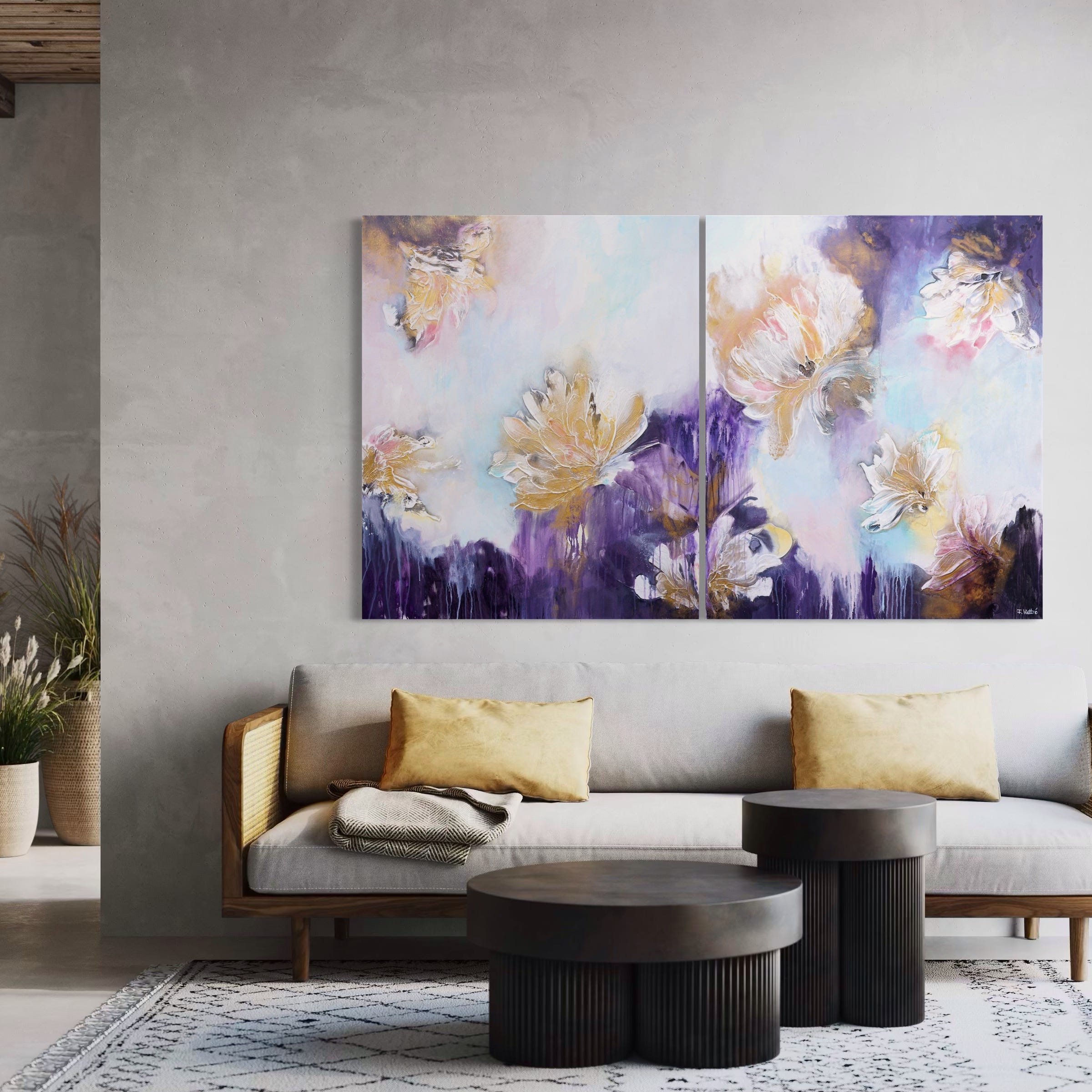 “Among the Stars high in the Sky ”, a diptych ( two-piece painting ) with warm toned purple, showcases brilliant white blossoms with beautiful gold accents .
