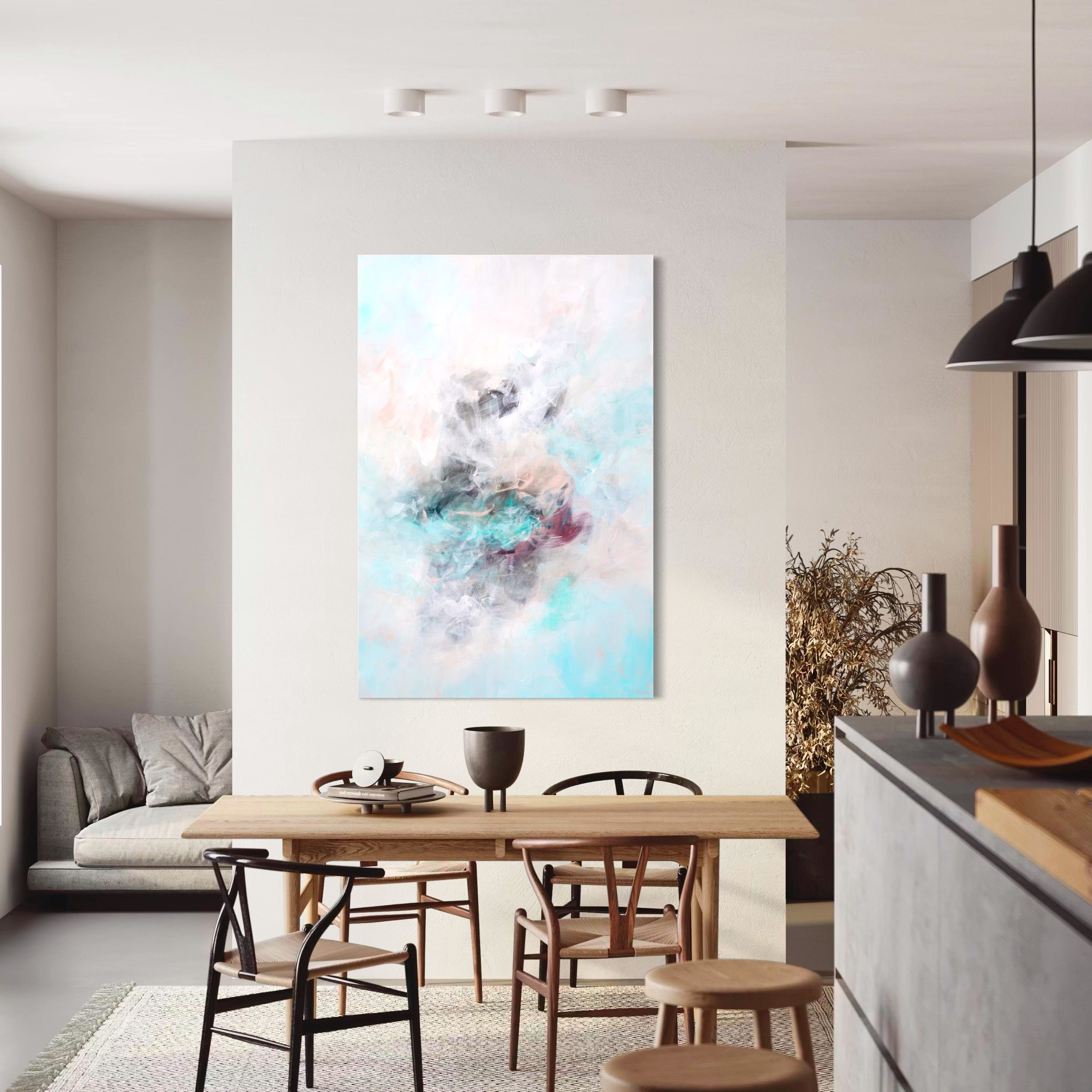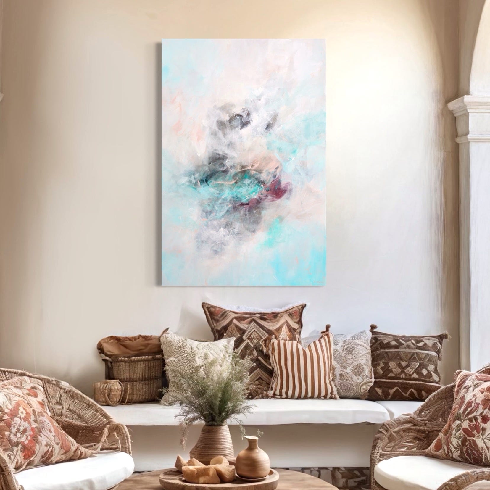 This abstract painting, with its calming teal hues and delicate white accents, captures the essence of a chilled ocean breeze on a dreamy afternoon.