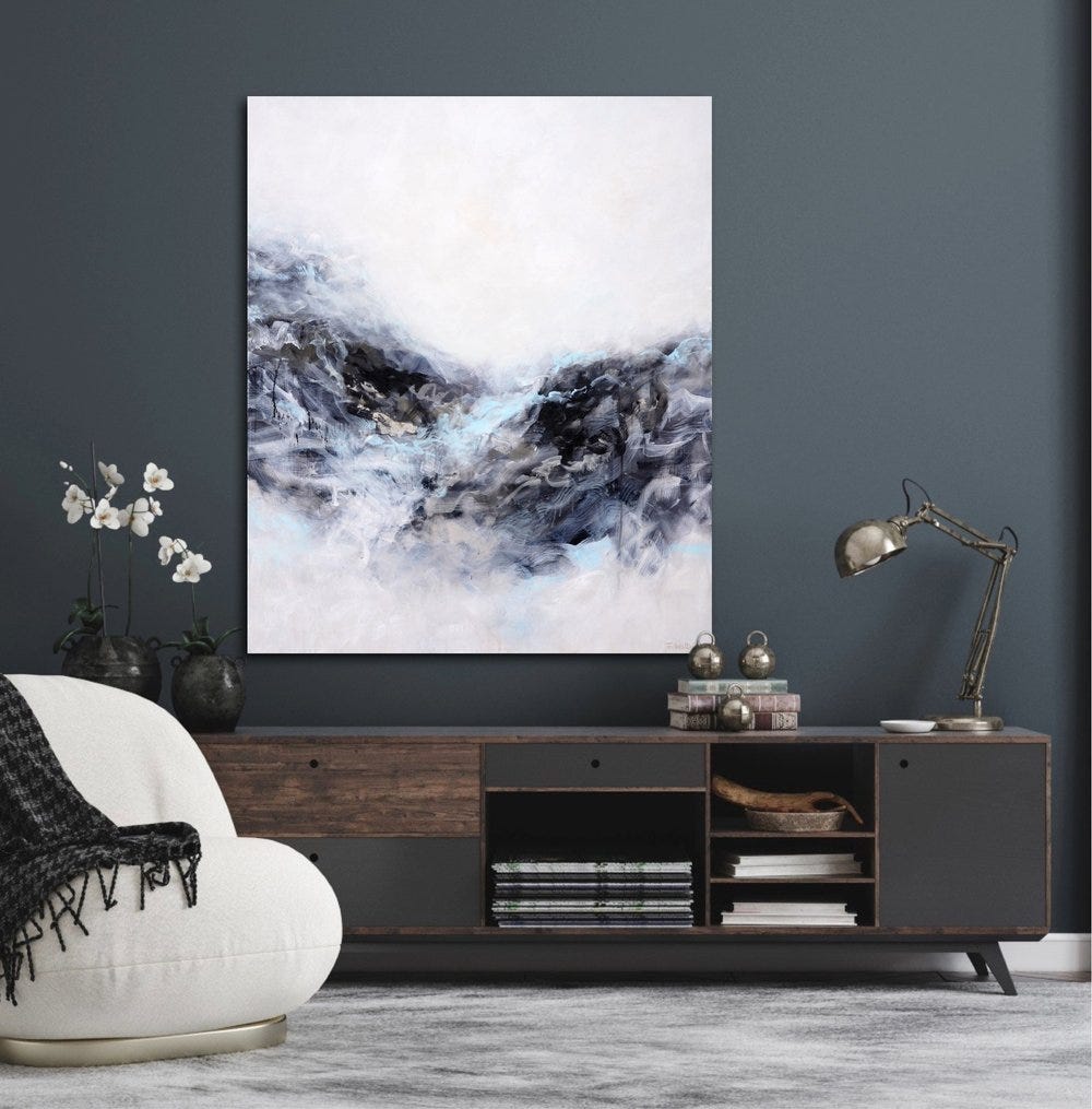 Dark grey hues swirl and undulate, mimicking the powerful currents of a river, while fresh blue and grey shades evoke the sky's reflection on water.