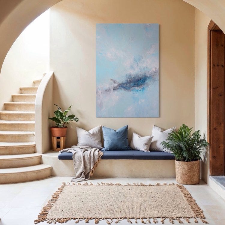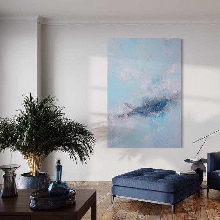 Awash in soothing shades of blue, the canvas is delicately punctuated by whispers of blush, creating a dreamy, ethereal atmosphere. Each brushstroke seems to dance across the surface, evoking the boundless mystery of a vast sky.